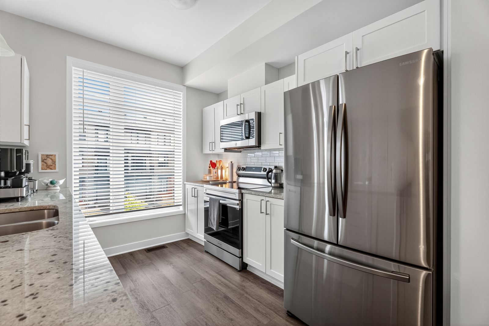 Available for immediate occupancy. Welcome to 172 Visor Private! Absolutely stunning, three story, EQ Luna Model City Townhome in sought after and popular Stittsville! Built in 2021, this 2 bedroom, 1.5 bath boasts a modern design and beautiful features, including an attached garage with garage door opener as well as a balcony of the living and dining area. The home is filled with natural light with north facing windows. The kitchen is tastefully designed with white cabinetry, white tile black splash, high-shine granite countertops, pot lights, and 9 foot ceilings. Large bedrooms with oversized windows, with the primary bedroom having a large walk-in closet. Washer and dryer are conveniently located on the third level off the bedrooms. Landscaping is maintenance free with river rock, perennial shrubs and ornamental grasses.Come live in this popular, family, friendly neighborhood, surrounded by nearby parks, schools, major shopping, Canadian Tire Centre, transit and much more! Freehold with association fee, which includes road maintenance.Flooring: Ceramic flooring on main level, hardwood on second level and carpeting on stairs and bedrooms.Including air conditioning, window blinds and eavestrough. Private road fee of $145.70/month for maintenance and garbage.