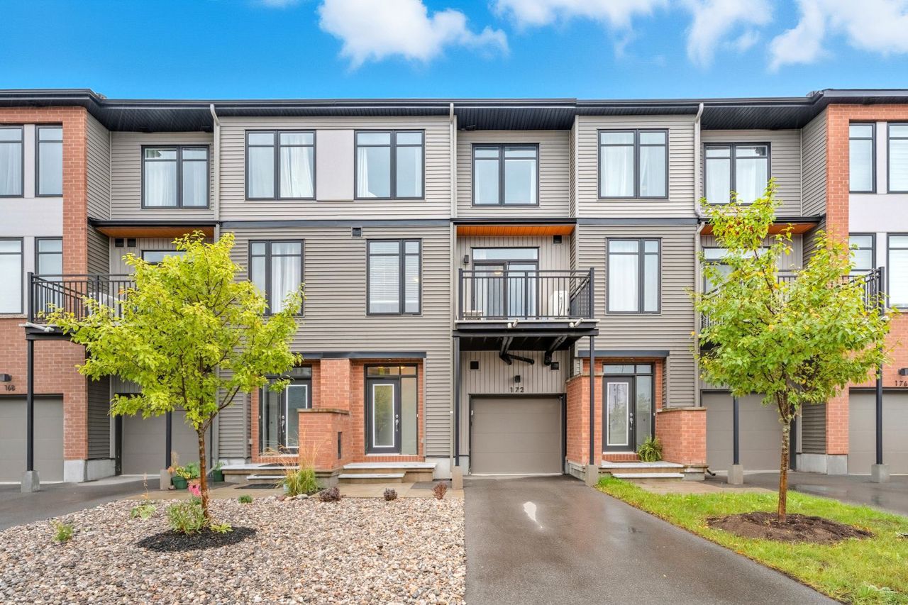 Available for immediate occupancy. Welcome to 172 Visor Private! Absolutely stunning, three story, EQ Luna Model City Townhome in sought after and popular Stittsville! Built in 2021, this 2 bedroom, 1.5 bath boasts a modern design and beautiful features, including an attached garage with garage door opener as well as a balcony of the living and dining area. The home is filled with natural light with north facing windows. The kitchen is tastefully designed with white cabinetry, white tile black splash, high-shine granite countertops, pot lights, and 9 foot ceilings. Large bedrooms with oversized windows, with the primary bedroom having a large walk-in closet. Washer and dryer are conveniently located on the third level off the bedrooms. Landscaping is maintenance free with river rock, perennial shrubs and ornamental grasses.Come live in this popular, family, friendly neighborhood, surrounded by nearby parks, schools, major shopping, Canadian Tire Centre, transit and much more! Freehold with association fee, which includes road maintenance.Flooring: Ceramic flooring on main level, hardwood on second level and carpeting on stairs and bedrooms.Including air conditioning, window blinds and eavestrough. Private road fee of $145.70/month for maintenance and garbage.